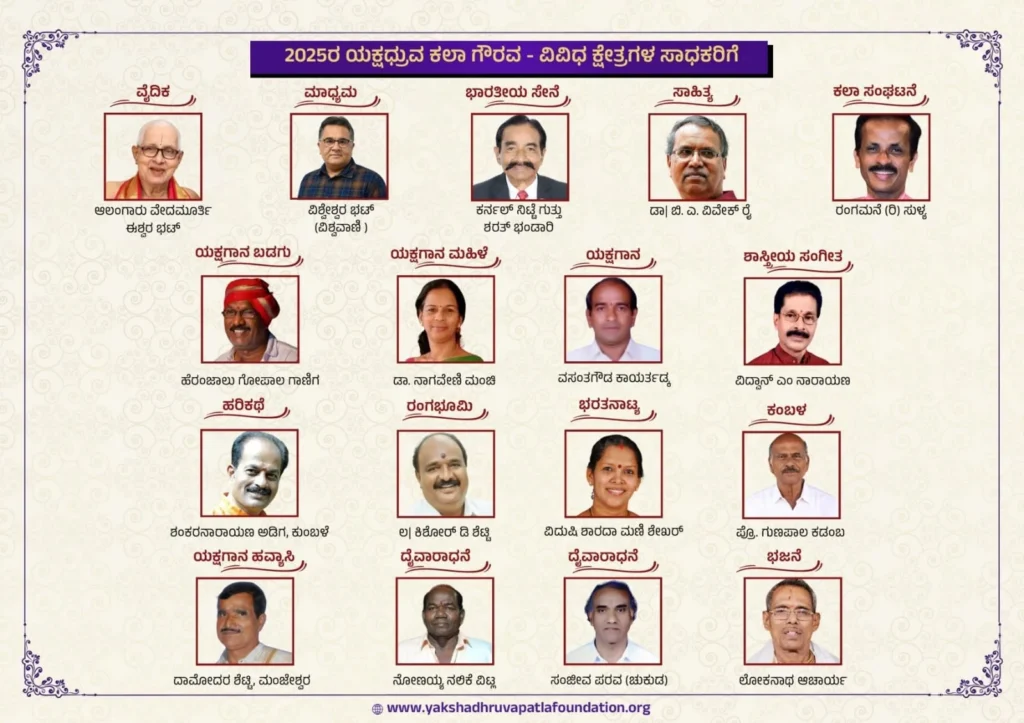 ವಿವಿಧ ಕ್ಷೇತ್ರಗಳ ಸಾಧಕರಿಗೆ 2025ರ ವರ್ಷದ ಯಕ್ಷಧ್ರುವ ಕಲಾಗೌರವ ಪ್ರಶಸ್ತಿ ನೀಡಲಾಯಿತು. ವೈದಿಕ ಕ್ಷೇತ್ರದಲ್ಲಿ ಸಾಧನೆಗೈದಿರುವುದಕ್ಕೆ ಅಲಂಗಾರು ವೇದಮೂರ್ತಿ ಈಶ್ವರ್ ಭಟ್ ಅವರಿಗೆ, ಮಾಧ್ಯಮ ಕ್ಷೇತ್ರದಲ್ಲಿ ವಿಶ್ವವಾಣಿಯ ವಿಶ್ವೇಶ್ವರ ಭಟ್, ಭಾರತೀಯ ಸೇನೆಯ ಕರ್ನಲ್ ನಿಟ್ಟೆಗುತ್ತು ಶರತ್ ಭಂಡಾರಿ, ಸಾಹಿತ್ಯದಲ್ಲಿ ಡಾ.ಬಿ.ಎ.ವಿವೇಕ್ ರೈ, ಯಕ್ಷಗಾನ ಮಹಿಳಾ ಕಲಾವಿದೆ ನಾಗವೇಣಿ ಮಂಚಿ, ಯಕ್ಷಗಾನ ಬಡಗು ಹೇರಂಜಾಲು ಗೋಪಾಲ ಗಾಣಿಗ, ಯಕ್ಷಗಾನದಲ್ಲಿ ವಸಂತಗೌಡ ಕಾರ್ಯತಡ್ಕ, ಶಾಸ್ತ್ರೀಯ ಸಂಗೀತದಲ್ಲಿ ವಿದ್ವಾನ್ ಎಂ.ನಾರಾಯಣ, ಹರಿಕಥೆ- ಶಂಕರ ನಾರಾಯಣ ಅಡಿಗ, ರಂಗಭೂಮಿ ಕಿಶೋರ್.ಡಿ.ಶೆಟ್ಟಿ, ಭರತ ನಾಟ್ಯದಲ್ಲಿ ವಿದೂಷಿ ಶಾರದಾ ಮಣಿಶೇಖರ್, ಕಂಬಳ ಪ್ರೋ. ಗುಣಪಾಲ ಕಡಂಬ, ಯಕ್ಷಗಾನ ಹವ್ಯಾಸಿ, ದಾಮೋದರ ಶೆಟ್ಟಿ ಮಂಜೇಶ್ವರ, ದೈವಾರಾಧನೆ- ನೋಣಯ್ಯ ನಲಿಕೆ ವಿಟ್ಲ, ದೈವಾರಾಧನೆ- ಸಂಜೀವ ಪರವ, ಭಜನೆ- ಲೋಕನಾಥ ಆಚಾರ್ಯ, ಅಲ್ಲದೇ ಯಕ್ಷಗಾನ ಕ್ಷೇತ್ರದಲ್ಲಿ ಹೆಸರು ಮಾಡಿರುವ ಮುಸ್ಲಿಂ ಹವ್ಯಾಸಿ ಯಕ್ಷಗಾನ ಕಲಾವಿದೆ ಅರ್ಶಿಯಾ ತನುವಿಟ್ಲ ಇವರಿಗೆ ಕಲಾಗೌರವ ಪ್ರಶಸ್ತಿ ನೀಡಿ ಗೌರವಿಸಲಾಯಿತು.