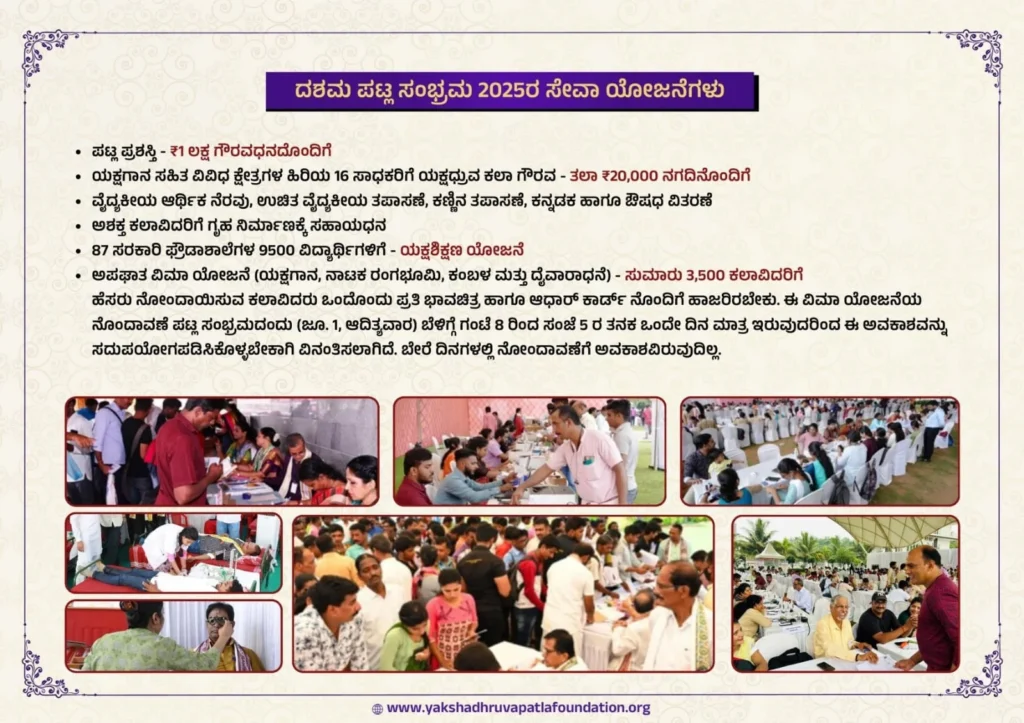 ವೈದ್ಯಕೀಯ ಧನಸಹಾಯ 15,000/-, ಆರೋಗ್ಯನಿಧಿ ಧನಸಹಾಯ 50,000/-, ಮರಣೋತ್ತರ ಧನಸಹಾಯ 25,000/-, ಗೃಹ ನಿರ್ಮಾಣ 2,50,000/-, ಪಟ್ಲ ಯಕ್ಷಾಶ್ರಯ ಯೋಜನೆ 5,00,000/-, ಪಟ್ಲ ಯಕ್ಷಾಶ್ರಯ ಯೋಜನೆ 5,00,000/-, ಈಗಾಗಲೇ ಪಟ್ಲ ಯಕ್ಷಾಶ್ರಯ ಯೋಜನೆಯಡಿಯಲ್ಲಿ ಗೃಹ ನಿರ್ಮಾಣಕ್ಕೆ ತಲಾ ೫,೦೦,೦೦೦/- ಲಕ್ಷ ರೂಪಾಯಿಗಳನ್ನು ಹಂತ ಹಂತವಾಗಿ ನೀಡುತ್ತಿದ್ದು, ಈ ಬಾರಿಯ ಪಟ್ಲ ದಶಮ ಸಂಭ್ರಮ ದಲ್ಲಿ ಅಧಿಕೃತವಾಗಿ ಚೆಕ್ ಗಳನ್ನು ವಿತರಿಸಲಾಯಿತು. ಅಲ್ಲದೇ, ಯಕ್ಷಗಾನ, ನಾಟಕ, ಕಂಬಳ, ದೈವಾರಾಧನೆ ಈ ಕ್ಷೇತ್ರದ 3 ಸಾವಿರಕ್ಕೂ ಅಧಿಕ ಮಂದಿಗೆ ಅಪಘಾತ ವಿಮೆ ಮಾಡಿಸಲಾಗಿದೆ.
